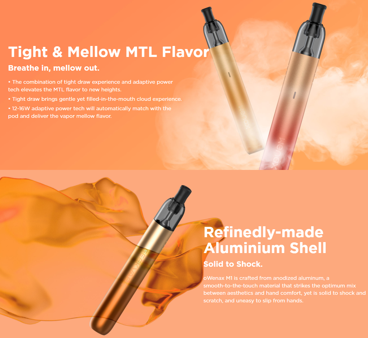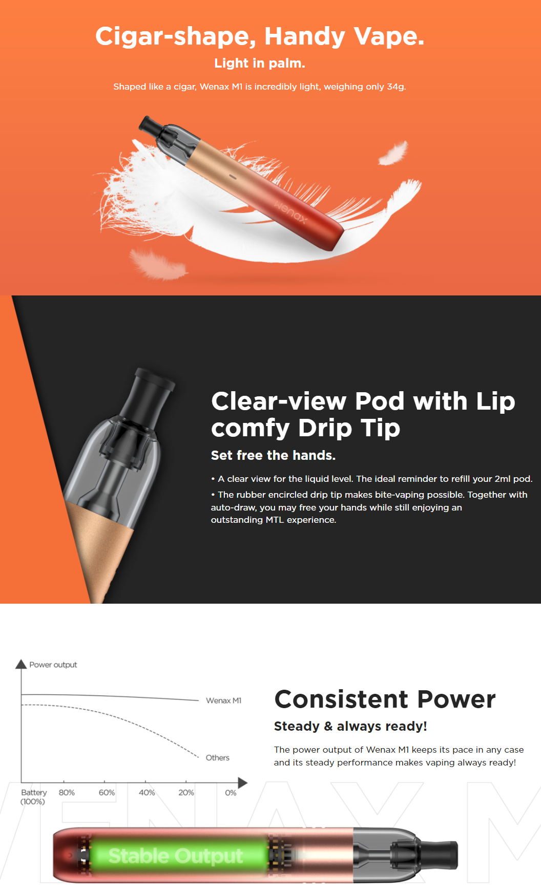 Geekvape WENAX M1 Kit عبارة عن قلم vape على شكل سيجار مع خفة مذهلة. يحتوي على بطارية داخلية 800 مللي أمبير يتم شحنها عبر منفذ USB Type-C. تم تحديد الإخراج ليتراوح من 9 واط إلى 16 واط ، وسوف تتفاعل تقنية الطاقة التكيفية 12-16 واط تلقائيًا مع مقاومة الملف الخاص بك وتتوافق مع خرطوشة بود Wenax M1.