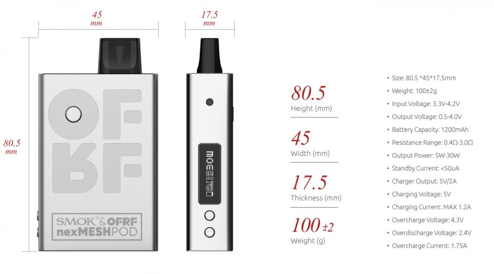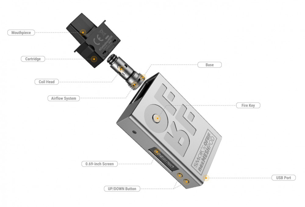 The long-lasting battery should get you several days of vaping before worrying about recharging. Unfortunately, SMOK has once again decided to stick with the old MicroUSB port instead of a more modern and faster USB-C port. The SMOK OFRF NexMesh Pod can output 5 to 30 watts and impedances range from 0.4 ohms to 3.0 ohms. This is more than adequate for a device of its size.