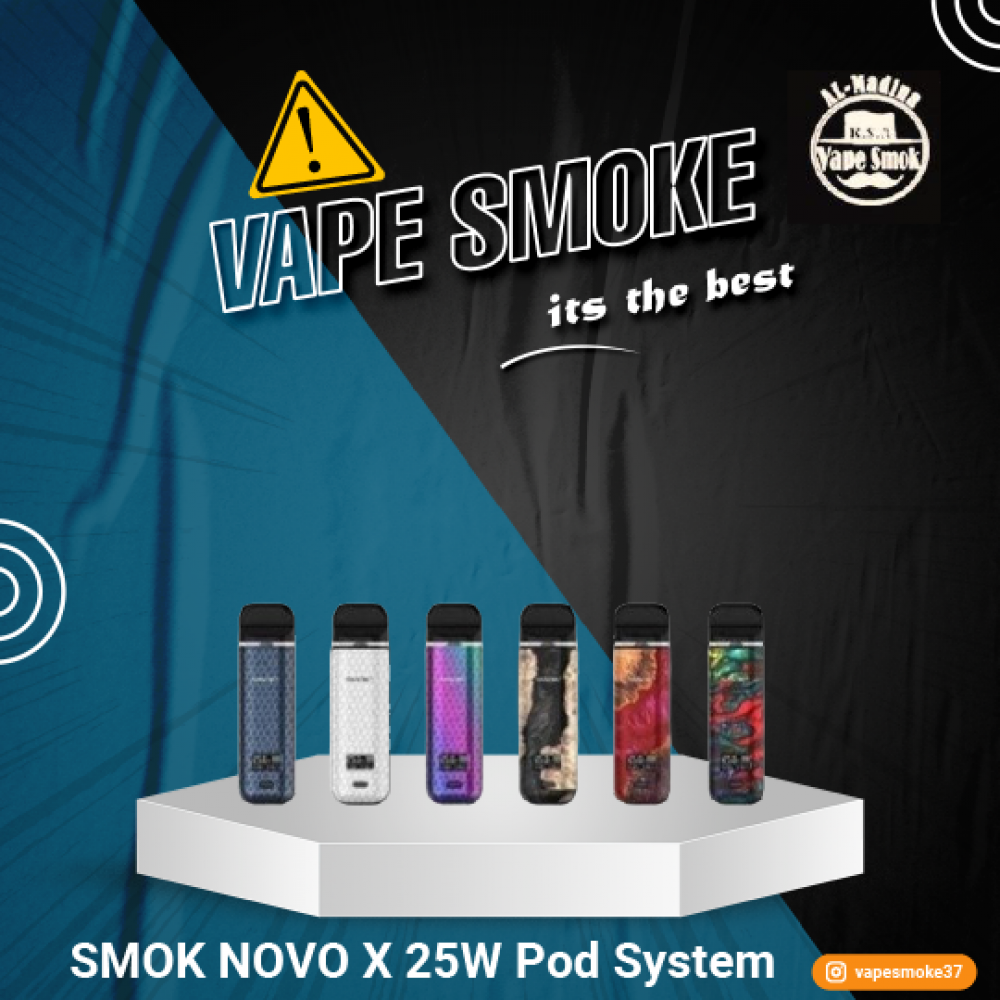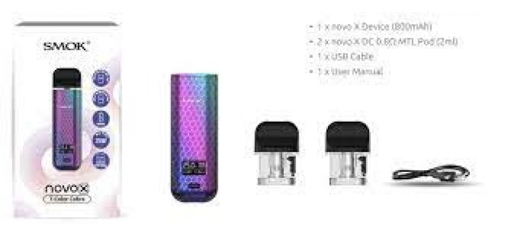 adjustable from 1 to 25 watts. SMOK Novo X comes with two pods, a 0.8ohm dual-coil pod and a single-mesh 0.8ohm pod, providing an experience